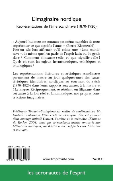 L’Imaginaire nordique expose les spécificités de la littérature et de la culture nordique à la fin du 19e siècle et dans la première partie du 20e. Entre pragmatisme et intériorité, le paradoxe scandinave est décrypté par Frédérique Toudoire-Surlapierre à travers trois pans d'étude qui cernent la notion d'« âme » : le rapport à l'autre, au langage, et à la nature, trois aspects primordiaux des représentations scandinaves.